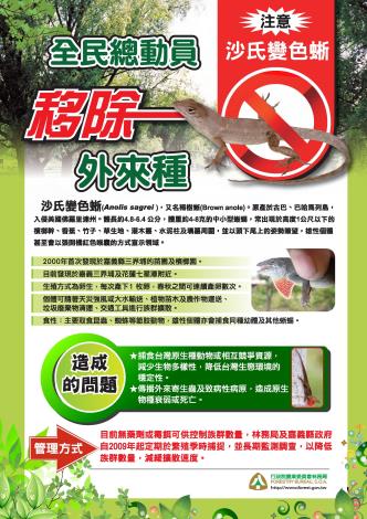 外來物種沙氏變色蜥,對本土原生生態會造成一定影響,對地區生態造成危害,並其可能隨園藝苗木移動而擴散。如民眾發現該外來種之蹤跡,可逕自捕捉,並通報本市動物保護處處理。