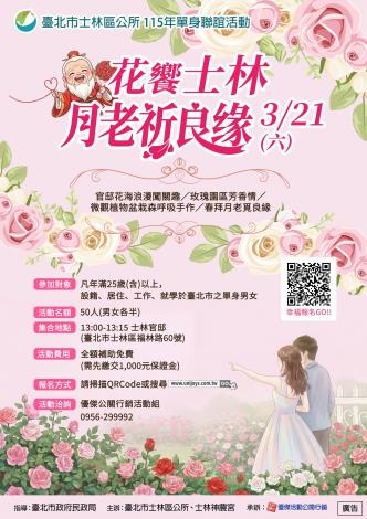 臺北市士林區公所將於115年3月21日(星期六)辦理「花饗士林-月老祈良緣」單身聯誼活動,名額為男、女性各25人,歡迎年滿25歲(含)以上,設籍、居住、工作或就學於臺北市之單身者報名參加,活動詳情請參閱報名簡章。
